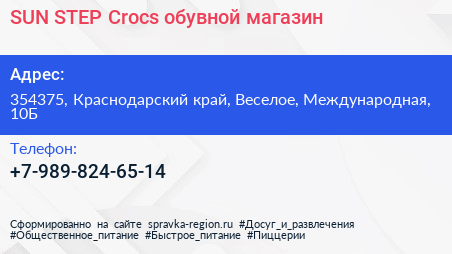 SUN STEP Crocs, обувной магазин по адресу 354375, Краснодарский край, Веселое, Международная, 10Б в дальнейшем Организация, размещена в следующих категориях: