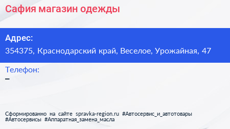 Сафия, магазин одежды по адресу 354375, Краснодарский край, Веселое, Урожайная, 47 в дальнейшем Организация, размещена в следующих категориях: