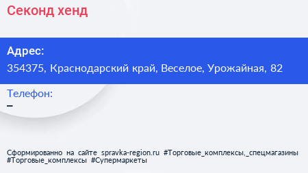 Секонд-хенд по адресу 354375, Краснодарский край, Веселое, Урожайная, 82 в дальнейшем Организация, размещена в следующих категориях: