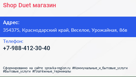 Shop Duet, магазин по адресу 354375, Краснодарский край, Веселое, Урожайная, 86в в дальнейшем Организация, размещена в следующих категориях: