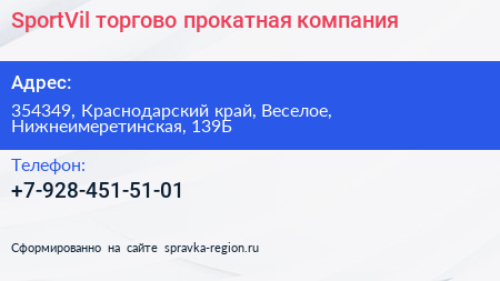 SportVil, торгово-прокатная компания по адресу 354349, Краснодарский край, Веселое, Нижнеимеретинская, 139Б в дальнейшем Организация, размещена в следующих категориях: