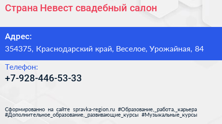 Страна Невест, свадебный салон по адресу 354375, Краснодарский край, Веселое, Урожайная, 84 в дальнейшем Организация, размещена в следующих категориях: