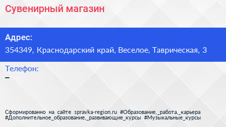Сувенирный магазин по адресу 354349, Краснодарский край, Веселое, Таврическая, 3 в дальнейшем Организация, размещена в следующих категориях: