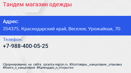 Тандем, магазин одежды по адресу 354375, Краснодарский край, Веселое, Урожайная, 70 в дальнейшем Организация, размещена в следующих категориях: