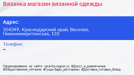 Вязанка, магазин вязанной одежды по адресу 354349, Краснодарский край, Веселое, Нижнеимеретинская, 133 в дальнейшем Организация, размещена в следующих категориях: