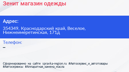 Зенит, магазин одежды по адресу 354349, Краснодарский край, Веселое, Нижнеимеретинская, 171д в дальнейшем Организация, размещена в следующих категориях: