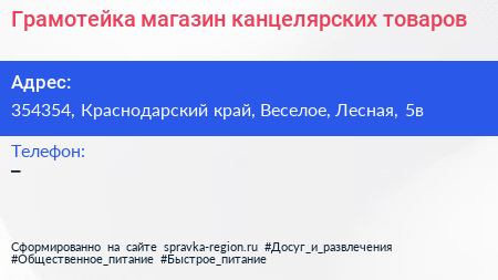 Грамотейка, магазин канцелярских товаров по адресу 354354, Краснодарский край, Веселое, Лесная, 5в в дальнейшем Организация, размещена в следующих категориях: