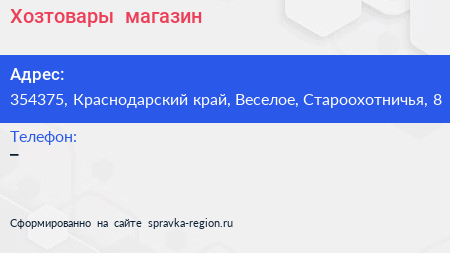 Хозтовары+, магазин по адресу 354375, Краснодарский край, Веселое, Староохотничья, 8 в дальнейшем Организация, размещена в следующих категориях: