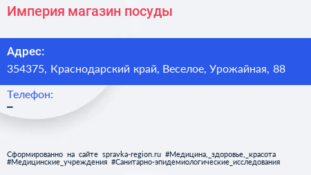 Империя, магазин посуды по адресу 354375, Краснодарский край, Веселое, Урожайная, 88 в дальнейшем Организация, размещена в следующих категориях: