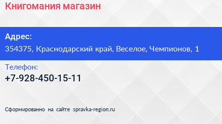 Книгомания, магазин по адресу 354375, Краснодарский край, Веселое, Чемпионов, 1 в дальнейшем Организация, размещена в следующих категориях: