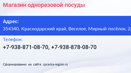 Магазин одноразовой посуды по адресу 354340, Краснодарский край, Веселое, Мирный посёлок, 2а в дальнейшем Организация, размещена в следующих категориях: