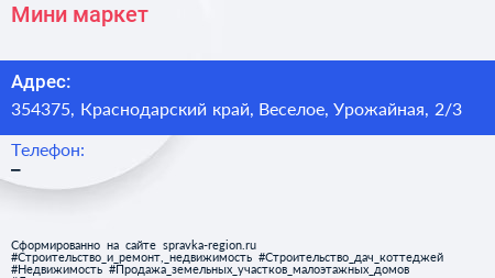 Мини-маркет по адресу 354375, Краснодарский край, Веселое, Урожайная, 2/3 в дальнейшем Организация, размещена в следующих категориях: