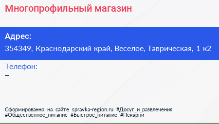 Многопрофильный магазин по адресу 354349, Краснодарский край, Веселое, Таврическая, 1 к2 в дальнейшем Организация, размещена в следующих категориях: