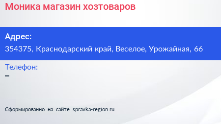 Моника, магазин хозтоваров по адресу 354375, Краснодарский край, Веселое, Урожайная, 66 в дальнейшем Организация, размещена в следующих категориях: