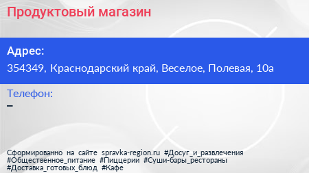Продуктовый магазин по адресу 354349, Краснодарский край, Веселое, Полевая, 10а в дальнейшем Организация, размещена в следующих категориях:
