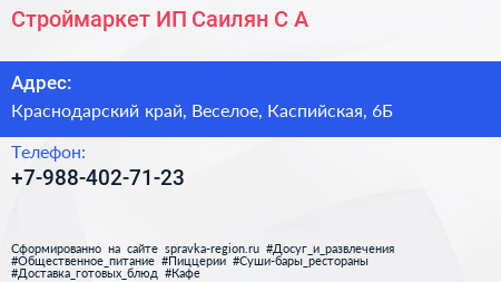 Строймаркет, ИП Саилян С.А. по адресу Краснодарский край, Веселое, Каспийская, 6Б в дальнейшем Организация, размещена в следующих категориях: