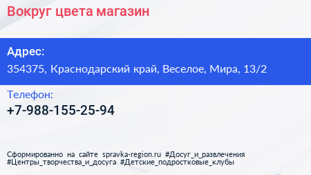 Вокруг цвета, магазин по адресу 354375, Краснодарский край, Веселое, Мира, 13/2 в дальнейшем Организация, размещена в следующих категориях: