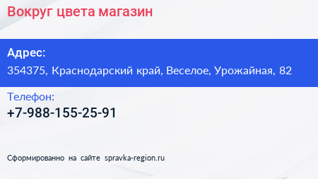 Вокруг цвета, магазин по адресу 354375, Краснодарский край, Веселое, Урожайная, 82 в дальнейшем Организация, размещена в следующих категориях: