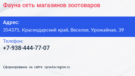 Фауна, сеть магазинов зоотоваров по адресу 354375, Краснодарский край, Веселое, Урожайная, 39 в дальнейшем Организация, размещена в следующих категориях: