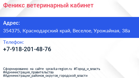 Феникс, ветеринарный кабинет по адресу 354375, Краснодарский край, Веселое, Урожайная, 38а в дальнейшем Организация, размещена в следующих категориях: