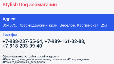 Stylish Dog, зоомагазин по адресу 354375, Краснодарский край, Веселое, Каспийская, 25а в дальнейшем Организация, размещена в следующих категориях: