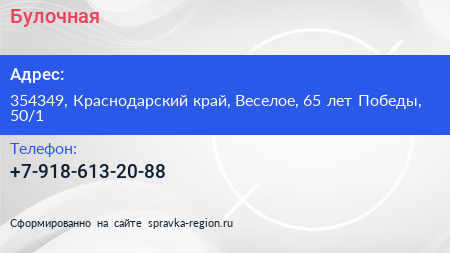 Булочная по адресу 354349, Краснодарский край, Веселое, 65 лет Победы, 50/1 в дальнейшем Организация, размещена в следующих категориях: