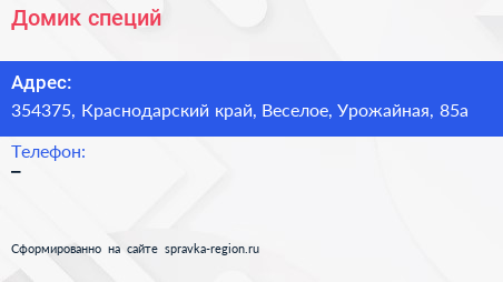 Домик специй по адресу 354375, Краснодарский край, Веселое, Урожайная, 85а в дальнейшем Организация, размещена в следующих категориях: