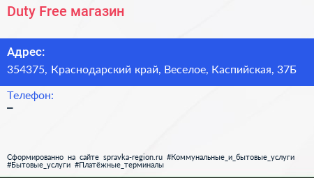 Duty Free, магазин по адресу 354375, Краснодарский край, Веселое, Каспийская, 37Б в дальнейшем Организация, размещена в следующих категориях: