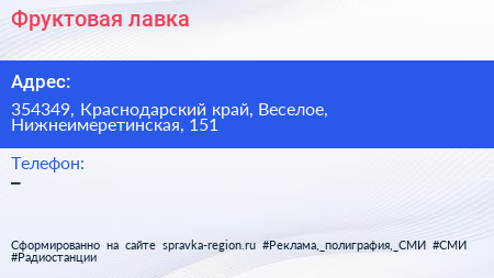 Фруктовая лавка по адресу 354349, Краснодарский край, Веселое, Нижнеимеретинская, 151 в дальнейшем Организация, размещена в следующих категориях: