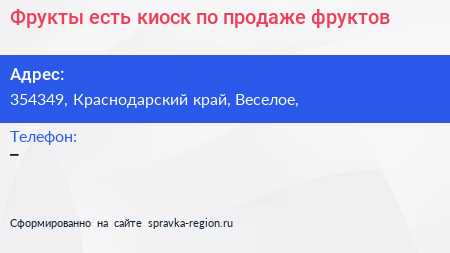 Фрукты есть, киоск по продаже фруктов по адресу 354349, Краснодарский край, Веселое, в дальнейшем Организация, размещена в следующих категориях: