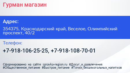 Гурман, магазин по адресу 354375, Краснодарский край, Веселое, Олимпийский проспект, 40/2 в дальнейшем Организация, размещена в следующих категориях:
