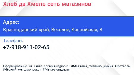 Хлеб да Хмель, сеть магазинов по адресу Краснодарский край, Веселое, Каспийская, 8 в дальнейшем Организация, размещена в следующих категориях: