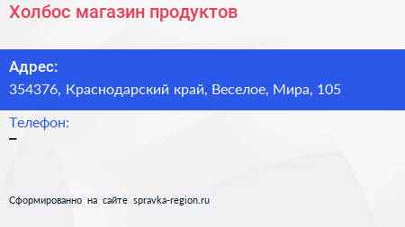 Холбос, магазин продуктов по адресу 354376, Краснодарский край, Веселое, Мира, 105 в дальнейшем Организация, размещена в следующих категориях:
