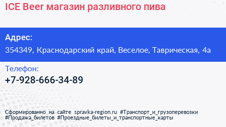 ICE Beer, магазин разливного пива по адресу 354349, Краснодарский край, Веселое, Таврическая, 4а в дальнейшем Организация, размещена в следующих категориях: