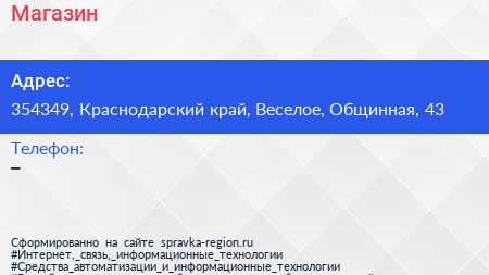 Магазин по адресу 354349, Краснодарский край, Веселое, Общинная, 43 в дальнейшем Организация, размещена в следующих категориях: