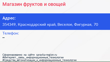 Магазин фруктов и овощей по адресу 354349, Краснодарский край, Веселое, Фигурная, 70 в дальнейшем Организация, размещена в следующих категориях: