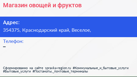 Магазин овощей и фруктов по адресу 354375, Краснодарский край, Веселое, в дальнейшем Организация, размещена в следующих категориях: