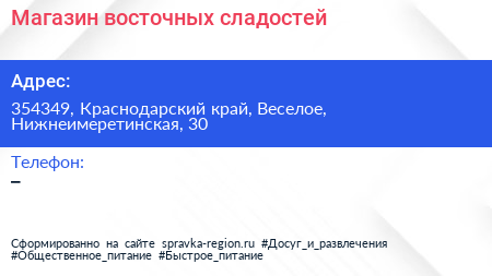 Магазин восточных сладостей по адресу 354349, Краснодарский край, Веселое, Нижнеимеретинская, 30 в дальнейшем Организация, размещена в следующих категориях: