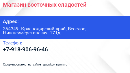 Магазин восточных сладостей по адресу 354349, Краснодарский край, Веселое, Нижнеимеретинская, 171д в дальнейшем Организация, размещена в следующих категориях: