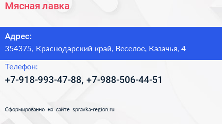 Мясная лавка по адресу 354375, Краснодарский край, Веселое, Казачья, 4 в дальнейшем Организация, размещена в следующих категориях: