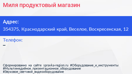 Миля, продуктовый магазин по адресу 354375, Краснодарский край, Веселое, Воскресенская, 12 в дальнейшем Организация, размещена в следующих категориях: