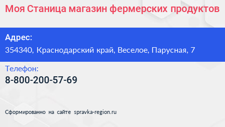 Моя Станица, магазин фермерских продуктов по адресу 354340, Краснодарский край, Веселое, Парусная, 7 в дальнейшем Организация, размещена в следующих категориях: