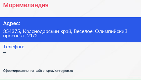 Моремеландия по адресу 354375, Краснодарский край, Веселое, Олимпийский проспект, 21/2 в дальнейшем Организация, размещена в следующих категориях: