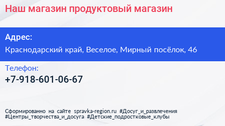 Наш магазин, продуктовый магазин по адресу Краснодарский край, Веселое, Мирный посёлок, 46 в дальнейшем Организация, размещена в следующих категориях: