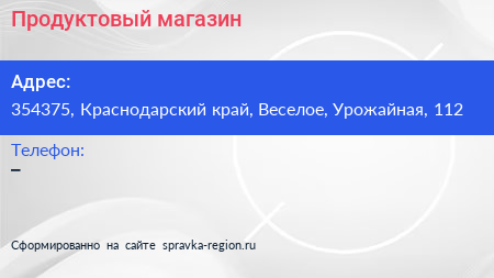 Продуктовый магазин по адресу 354375, Краснодарский край, Веселое, Урожайная, 112 в дальнейшем Организация, размещена в следующих категориях: