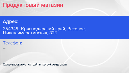 Продуктовый магазин по адресу 354349, Краснодарский край, Веселое, Нижнеимеретинская, 32Б в дальнейшем Организация, размещена в следующих категориях: