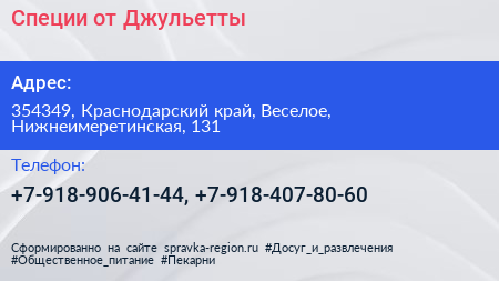 Специи от Джульетты по адресу 354349, Краснодарский край, Веселое, Нижнеимеретинская, 131 в дальнейшем Организация, размещена в следующих категориях: