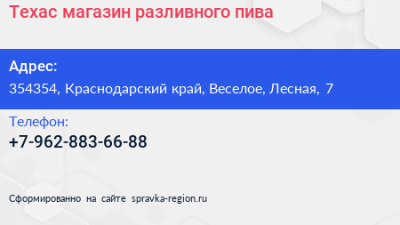 Техас, магазин разливного пива по адресу 354354, Краснодарский край, Веселое, Лесная, 7 в дальнейшем Организация, размещена в следующих категориях: