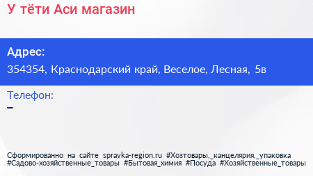 У тёти Аси, магазин по адресу 354354, Краснодарский край, Веселое, Лесная, 5в в дальнейшем Организация, размещена в следующих категориях: