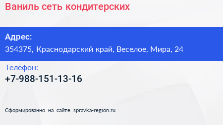 Ваниль, сеть кондитерских по адресу 354375, Краснодарский край, Веселое, Мира, 24 в дальнейшем Организация, размещена в следующих категориях: